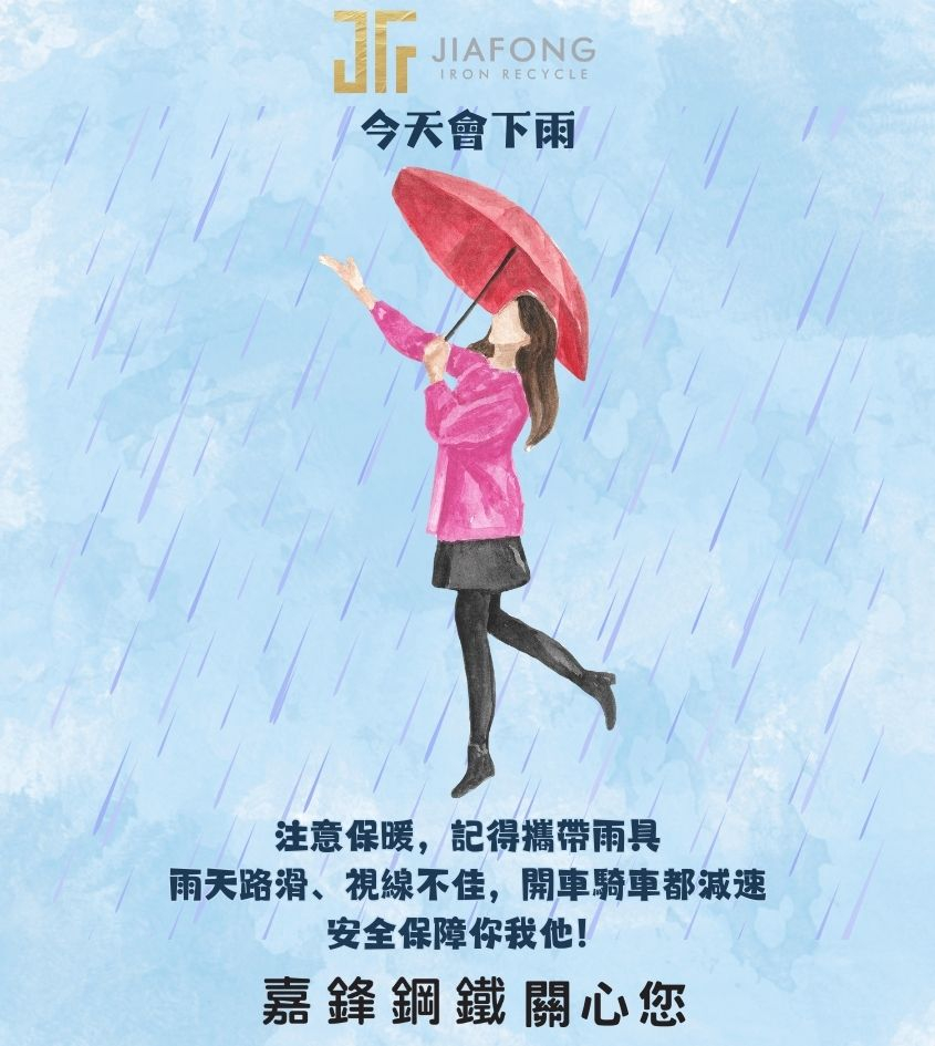 今天台中天氣濕冷 ,提醒您外出記得帶件外套及雨具,祝您有個愉快順心的一天。